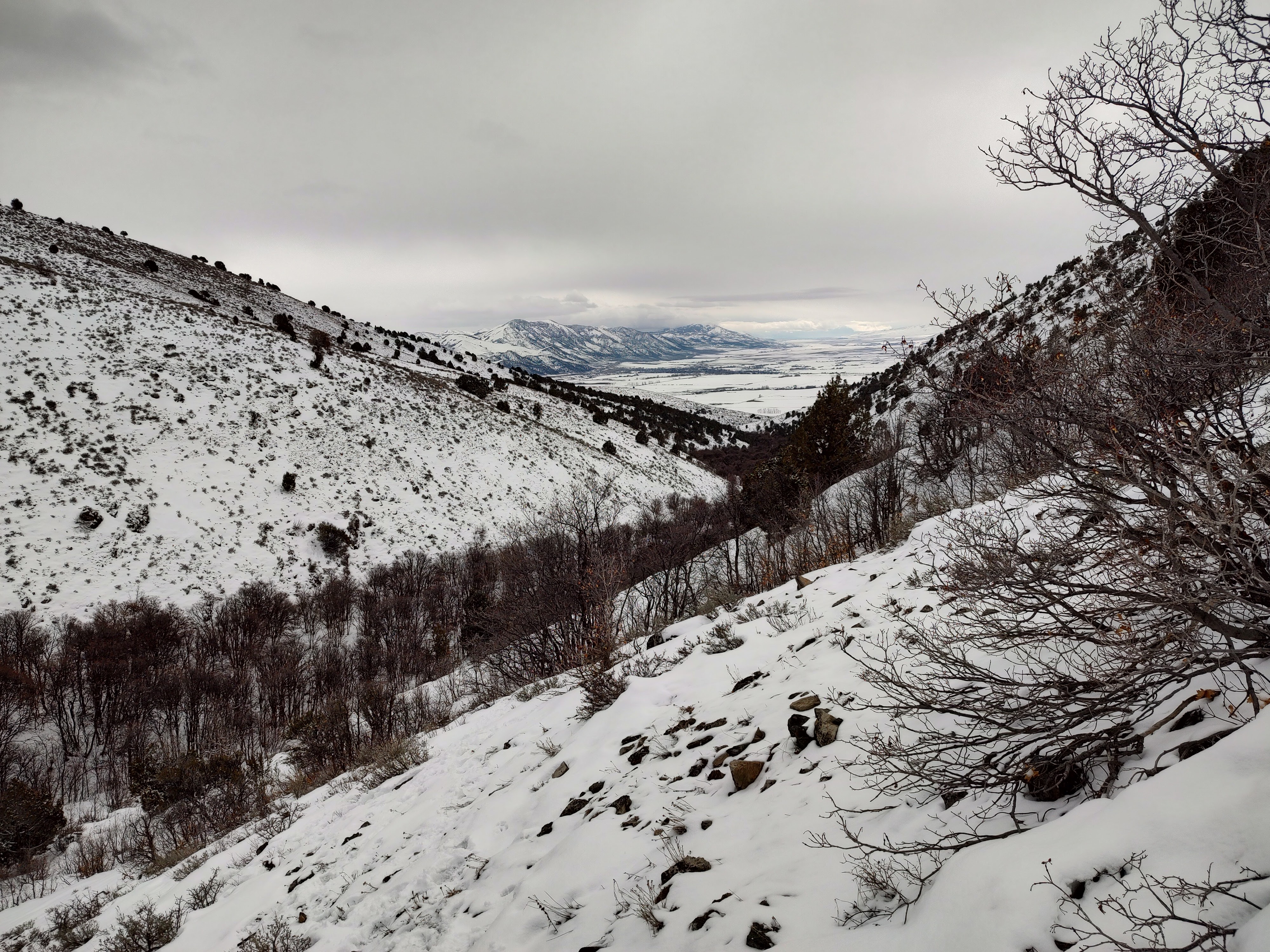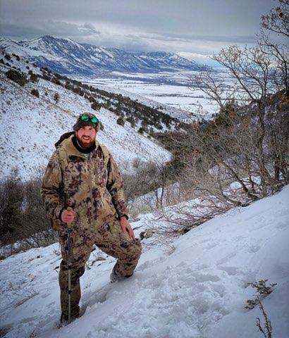 We made our way over to an area where Carson had treed a cat the day before, and he was confident that we would be able to get back on that lion’s track and there was a good chance we could end up treeing it again. We parked on the road and drove the UTV up the mountainside to the gate, where we parked and headed out on foot up a trail on the outside of a canyon known as “Secret Canyon”. From the outside face that we climbed, we could see back over the snow-covered valley in which Malad City is resides. This breathtaking view alone made the trip worthwhile, but the fun was only just beginning. When I say we headed out on foot, I should remind you that this trail went up the side of a mountain, and I had just arrived in Idaho the day before, having come from Missouri. Naturally I was not in the least bit acclimated to the thinner, drier air of higher altitudes and yet I was already being tasked with hiking up the side of a mountain, and I did my best to suck it up and try to keep pace with the others but that did not last long. We made a brief pit stop at the tree where Carson had had a cat the day before, and from there started searching for signs that would point us to fresh lion tracks.
