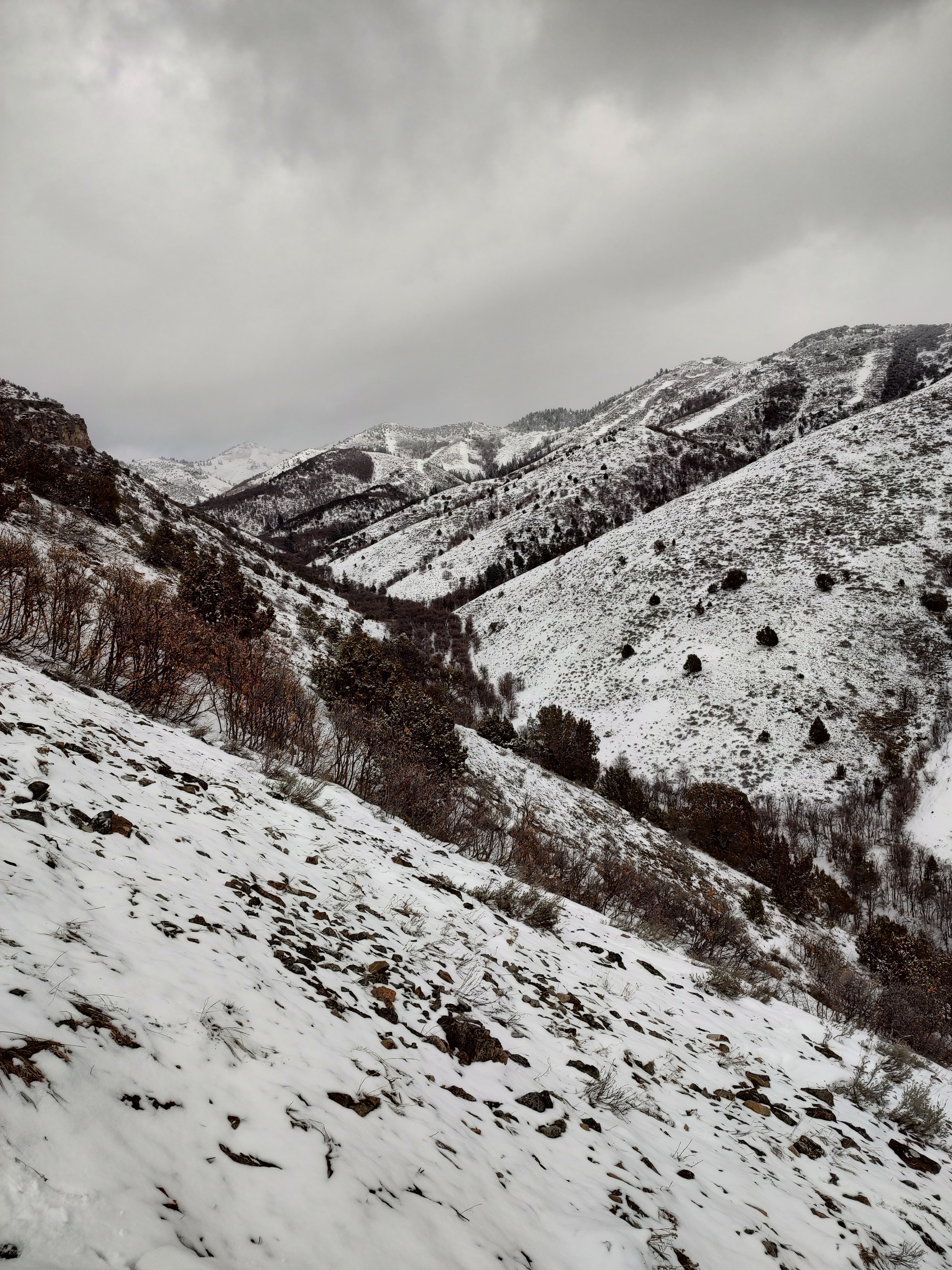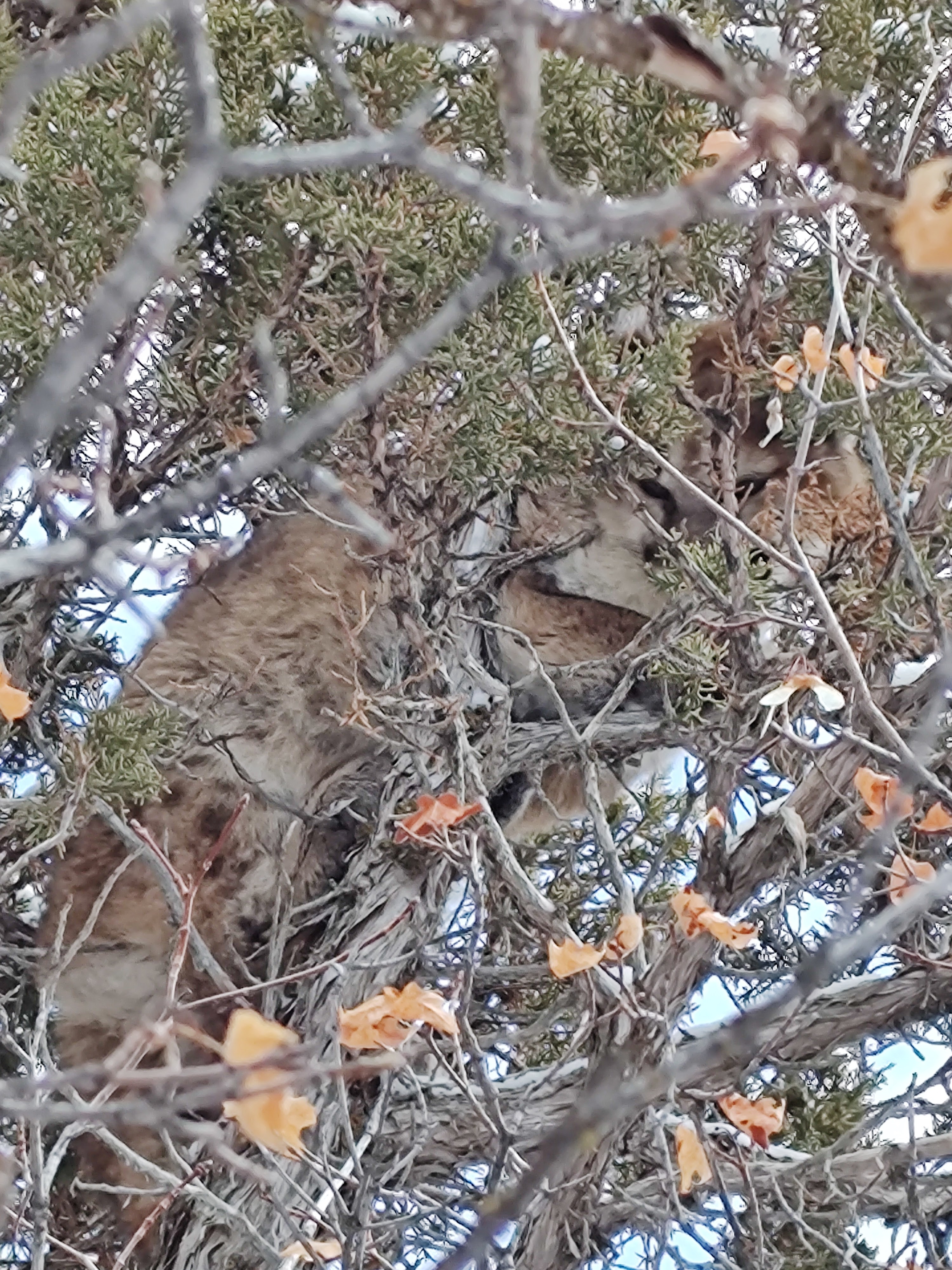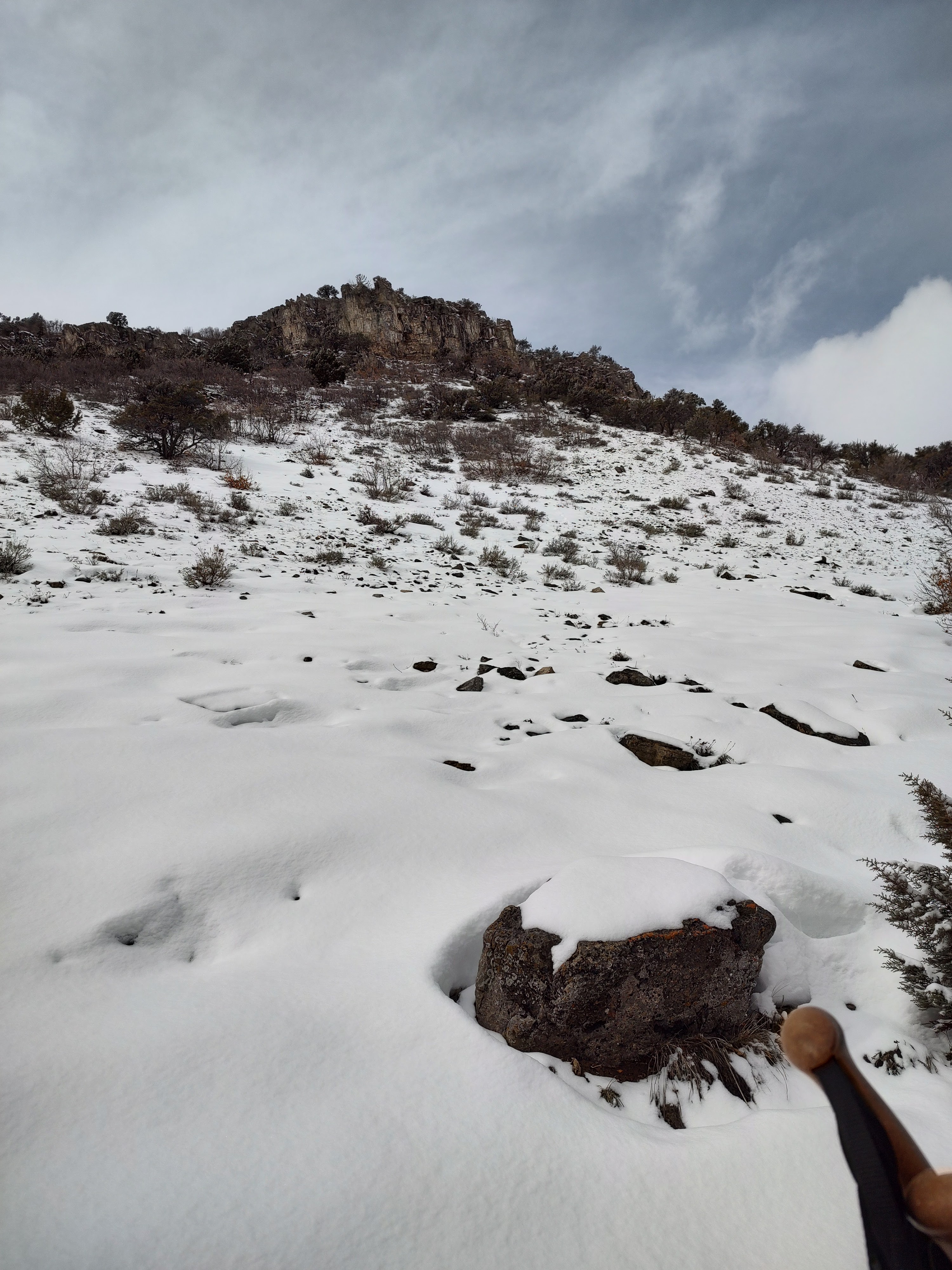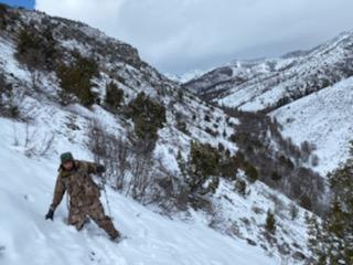 Carson led the way as we followed and hoped for a short pursuit. We had long since surpassed the point by which we needed to leave and Nick’s puppy was just going to have to hold out at the house a little longer. Much to our delight the hounds fired off again baying and barking just below us near the canyon road, indicating that the kitten had been treed for a third (and final) time. Somewhere along the way in all of this chaos I came to the startling realization that while we were continuing pursuit of the kitten, we hadn’t seen hide nor hair of the mother, and I was suddenly gripped with the fear that she could potentially show up behind us en route to protect her baby. As the guy bringing up the caboose in this parade that was all the motivation I needed to hurry up and stick close to the others, however the tricky terrain seemed to have other ideas for me as going down the mountain became almost more difficult than side-hilling. The good part is that mama did not, in fact, make her presence known to us, although I am fairly confident that she was never really too far away. I continued to slip and slide as much as walk down the mountain, at times conceding defeat on walking and choosing instead to tuck one leg and just slide over the top of the snow, letting gravity take its natural course. This new mode of transportation proved effective until I hit a bare patch of rock mid-slide and just about shattered my kneecap on a pile of rocks (which were promptly and violently picked up and given wings of flight).