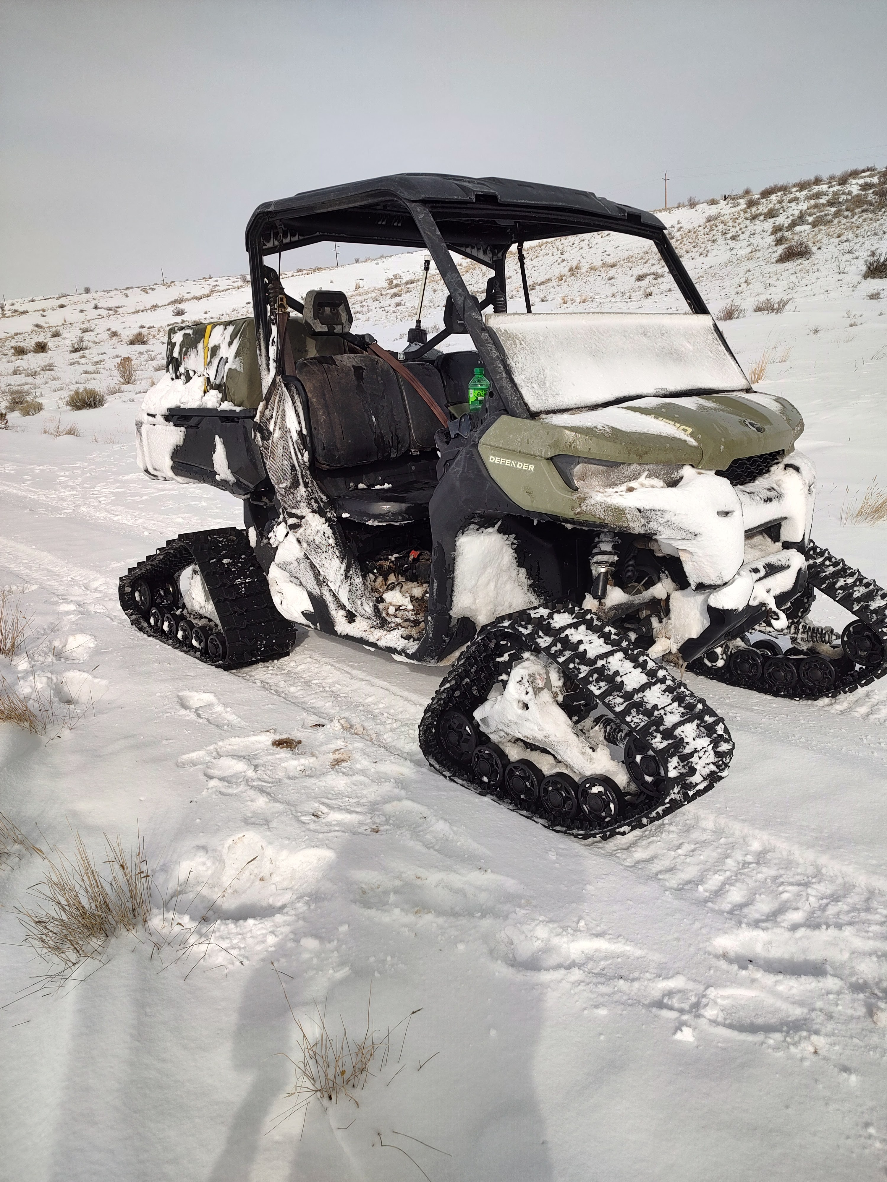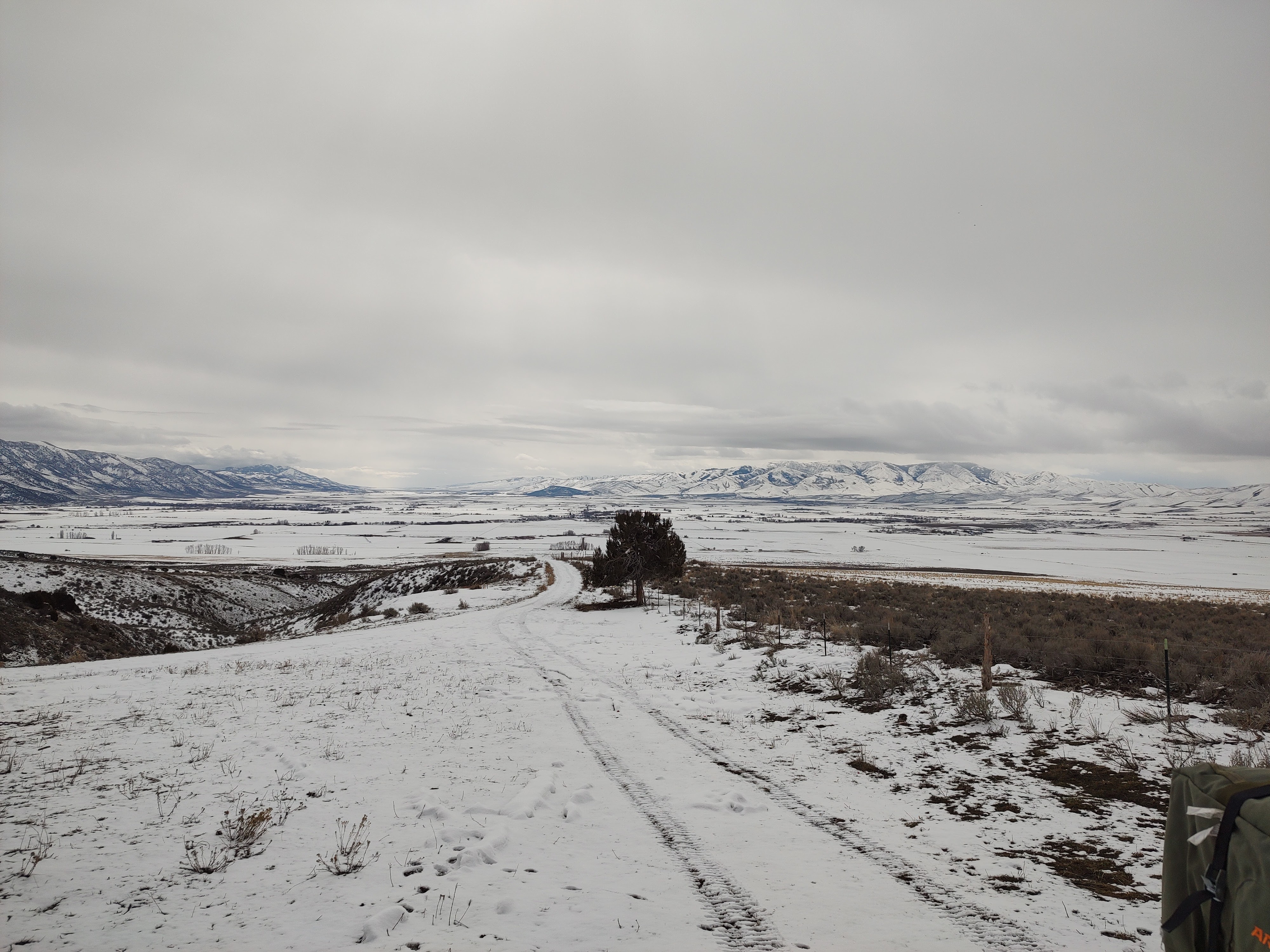 We started our day in a region of high desert in Southeast Idaho, with nary a tree to be found for miles. About as far as the eye could see was nothing but snow-covered desert sage and the occasional mesquite (I’d later learn that these are the “trees” which would become host to treed lions), all of which was covered over by a fresh blanket of snow. This was particularly concerning to me, as thus far my understanding of hounding mountain lions involved treeing the cat. I was reassured that we’d cross that bridge when we came to it; the first step was to find fresh mountain lion tracks. We piled in to a tracked UTV with Carson driving, Nick in the middle, and myself on the passenger side. Carson’s dogs, a pair of blue tick hounds (Blue and Pax), were crated in the back of the machine. Three grown men, donning heavy winter weather clothes, packed into a side-by-side made for a rather uncomfortable ride. As a result I ended up spending most of the drive with one leg angling out of the UTV. That leg managed to catch virtually all of the snow kicked up by the front track, where it promptly either piled up from the floorboard to my knees, and what was left got swirled up in the wind into my face.