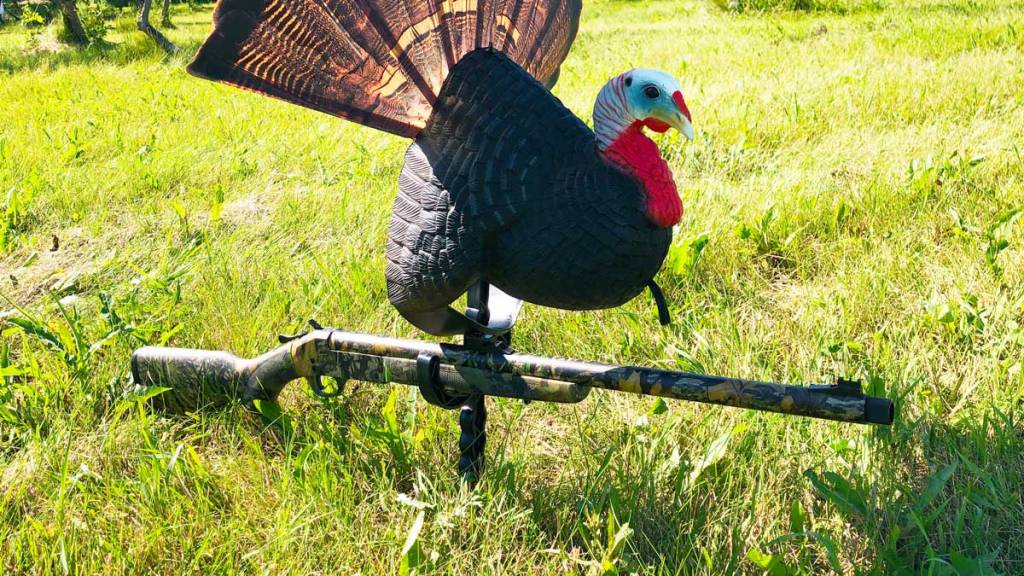 Before I go too far down this rabbit hole, I should pause for a moment to briefly describe what reaping is for anyone who may be unfamiliar. Reaping (also known as ‘fanning’ or ‘scoot-n-shoot’) is a style of turkey hunting where the hunter uses a turkey fan (some synthetic, some real) and/or a decoy like a shield, crouching or crawling behind it (or even mounting directly to the barrel of their gun) to get as close as possible to a gobbler by posing as another male coming to compete for area hens in order to harvest him at an incredibly close distance. As the reaping method has gained popularity in recent years, companies have capitalized on the growing market by developing products specifically designed for this style of hunting, such as the aforementioned gun mount and synthetic fans with viewing slots cut out.